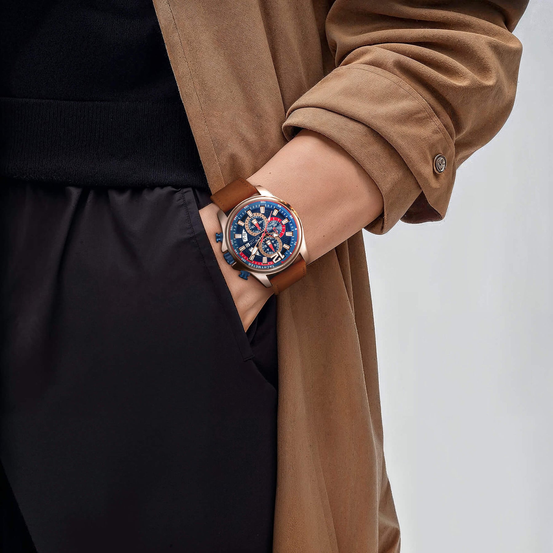 A fusion of style and refinement. Wrapped around your wrist is a supple tan leather strap, meticulously crafted to provide both comfort and durability. Paired with a warm rose gold case. The dial, adorned in a rich deep blue hue with fancy texture, serves as a canvas for this masterpiece. Accentuated by vibrant red highlights and equipped with three sub dials, featuring a chronograph movement and date window. Electric blue pushers provide a striking contrast to the rose gold case to create a modern flair. A distinguished watch with an exquisite design.