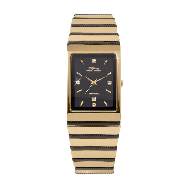 Our ever popular pair of watches have been finished in gold. Inspired by the exotic stripes of a King Cobra our pair of watches are guaranteed to strike it big on the design front. The perfectly polished gold ceramic case and bracelet also means you are covered as far as excellent quality goes. We have added extra detailing with black plated stainless steel detailing and a precision quartz date movement that is backed with our unlimited 5 year movement warranty. A final touch of luxury is the designer dial covered with a scratch resistant sapphire crystal and studded with 4 of our Diamondeau®- flawless simulated diamond. Both bracelets are fully adjustable and come with a double release butterfly buckle.