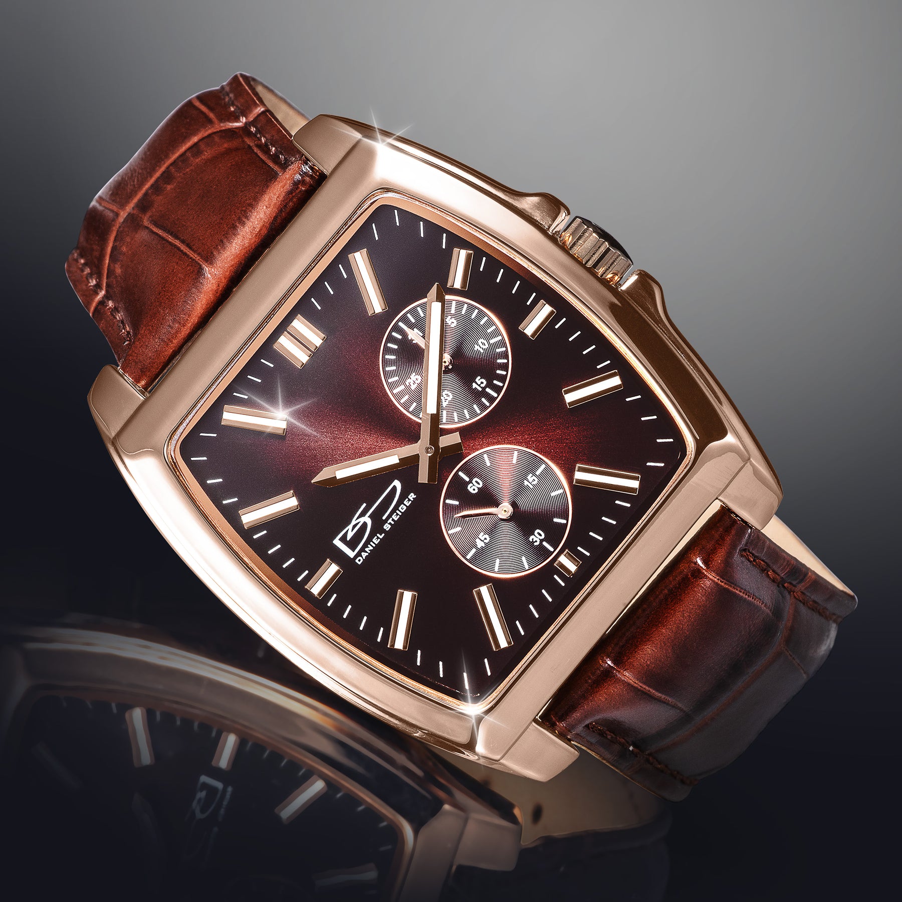 Unveil a new standard of sophistication with a timepiece that is a masterful fusion of contemporary design and timeless elegance. A tonneau shaped case exudes an air of distinction. Its harmonious curves and bold presence make a true statement piece. A rich chestnut brown sunray dial comes to life as rays of sunshine grace its surface, featuring two subdials for seconds and date. Completed with a croc effect leather strap. The fusion of luxurious brown leather and the polished case creates an unforgettable harmony that rests comfortably on your wrist.