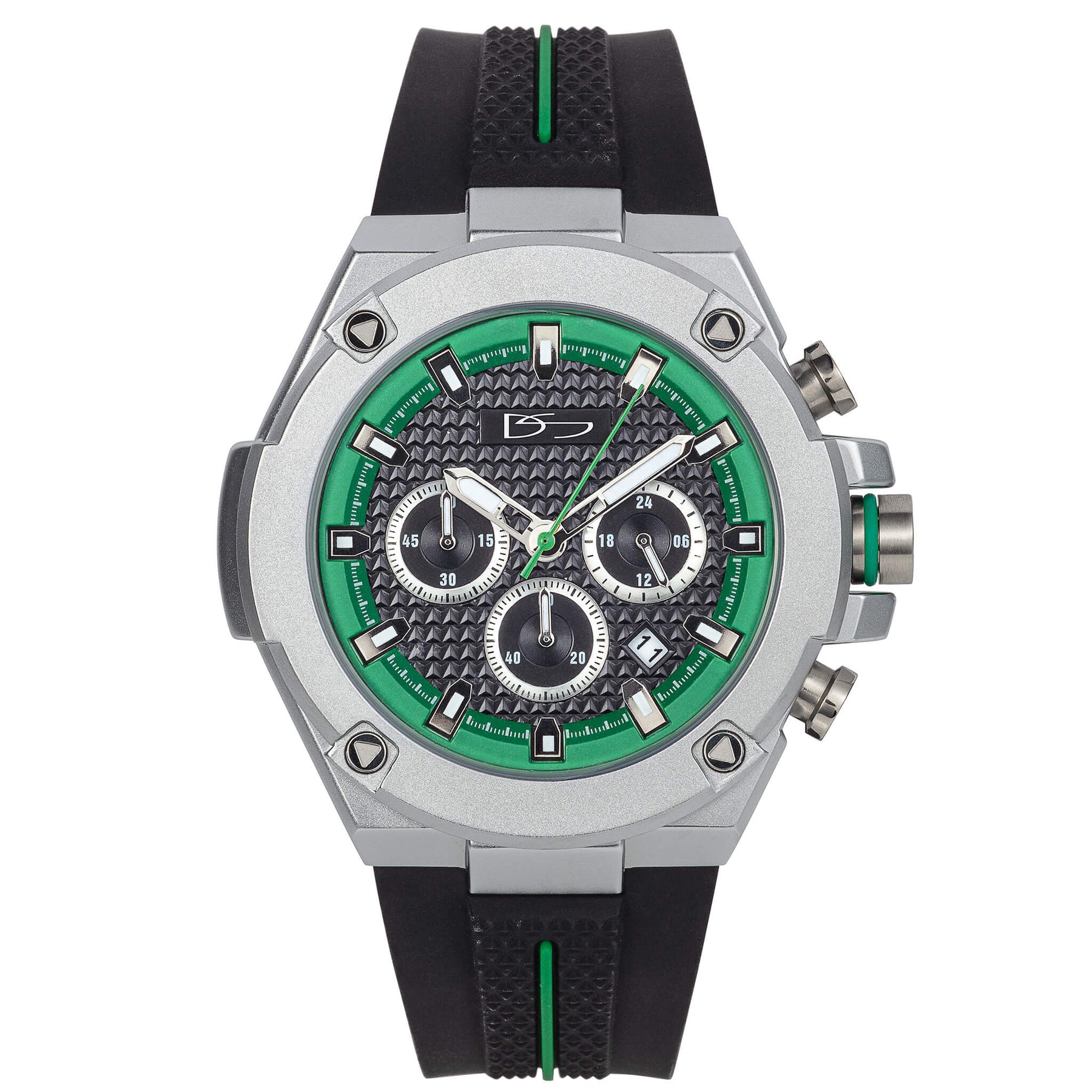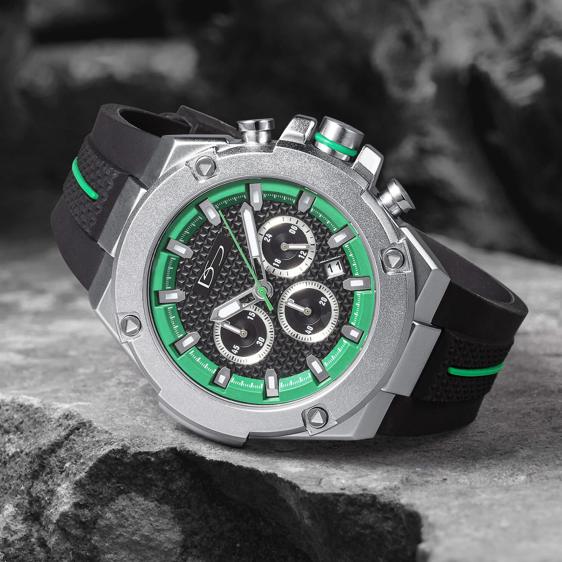 A masterpiece of precision and style. Featuring a sleek silicone strap in bold black, accented with striking green detailing. The silver case finish adds a touch of refinement to the rugged sporty aesthetic. The grooved black dial serves as a canvas for the artistry of time, while the vibrant hreen features punctuate the dial, hands and crown with a burst of energy and vitality. The chronograph movement and date window blend style and functionality seamlessly. This timepiece is a true testament to your dynamic lifestyle and impeccable taste.