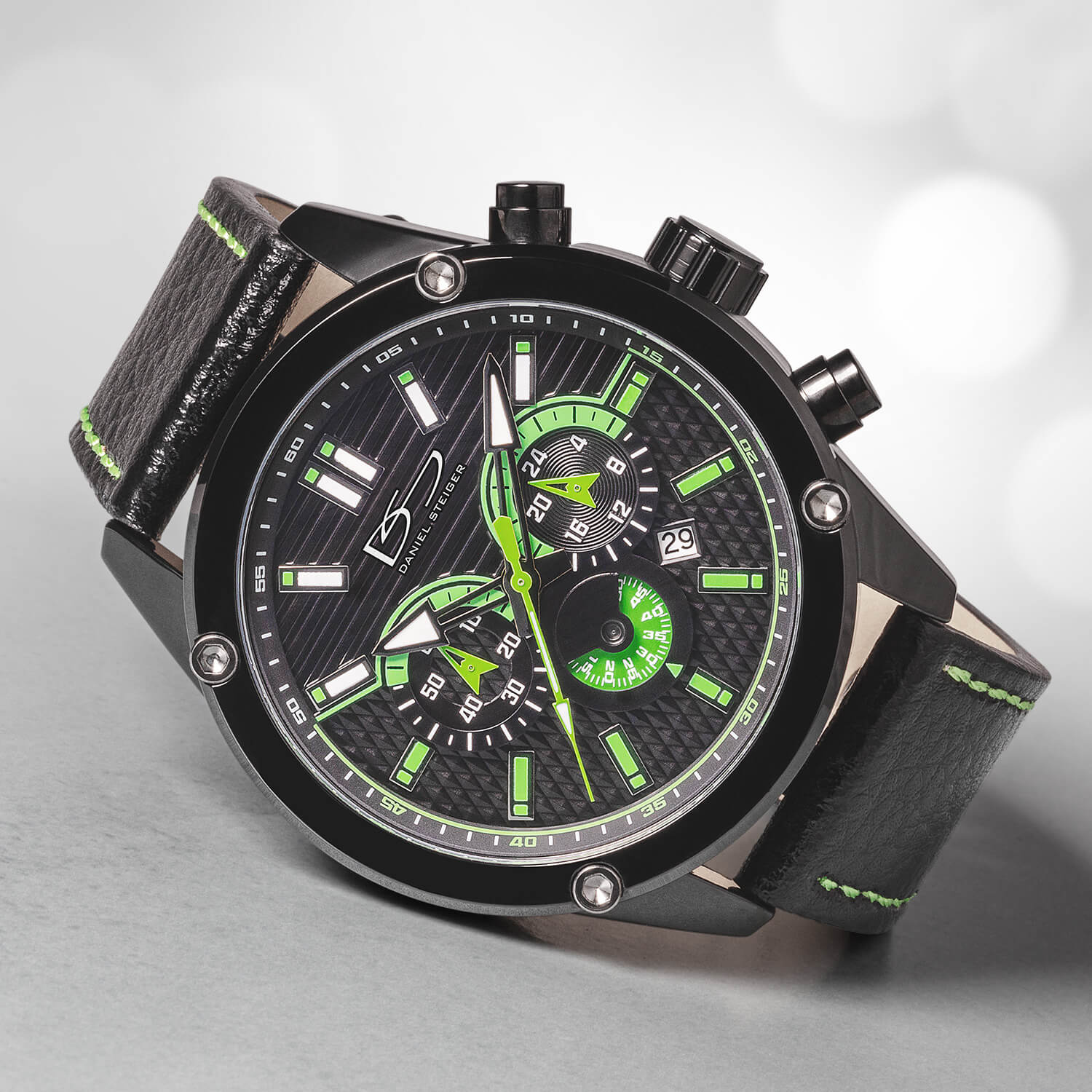 An eye-catching watch with a classic, masculine look. A sturdy textured leather black strap with contrasting green stitch detailing, leads to a black case with screws on the bezel. The dial is adorned with green highlights on a textured background and features a date window and chronograph movement. Precise and classic timepiece perfect for any occasion.