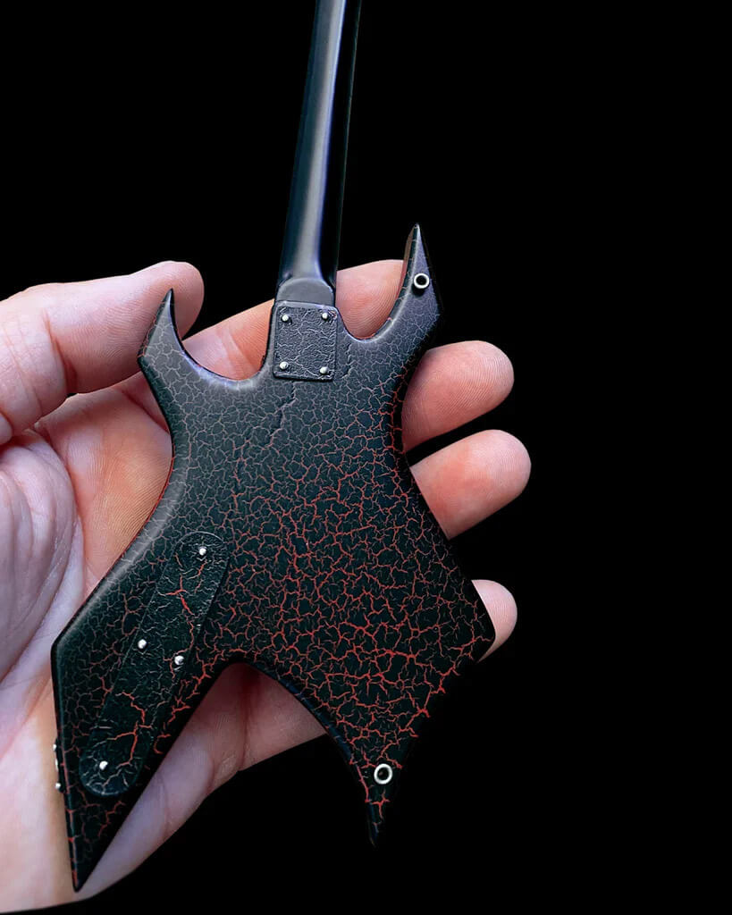 Expertly crafted in honor of Eddie's iconic Warlock guitar from NETFLIX's Stranger Things, this mini replica features a stunning crackle finish and all the signature details of the B.C. Rich NJ Warlock guitar. A must-have for any collector and avid fan of the series. This 1:4 scale guitar model is carefully handcrafted from solid wood and features metal tuning keys. This product comes with a guitar case gift box featuring a stamped silver foil, as well as an adjustable A-frame stand.