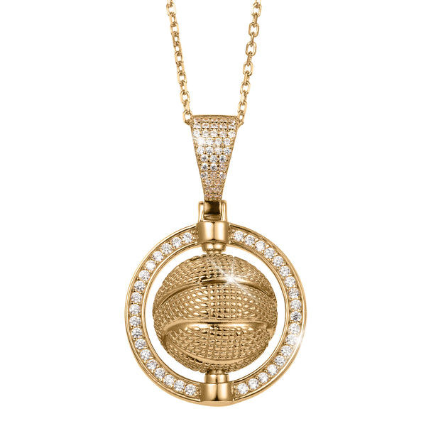 Pay tribute to one of America’s most iconic sports with a pendant that perfectly balances style and movement. Crafted in sterling silver with a luxurious yellow gold finish, a circle of brilliant Diamondeau®, flawless simulated diamonds frames a finely textured basketball that moves freely within the setting. Its design invites playful interaction, letting the ball spin smoothly at your touch, capturing the energy and rhythm of the game. Invented in 1891 by Dr. James Naismith, basketball quickly grew from a simple indoor pastime to a defining part of American culture. Today, it thrives at every level, from local courts to the global stage of the NBA, inspiring fans across generations. This pendant celebrates that legacy, letting enthusiasts carry a piece of the game’s excitement and history wherever they go.