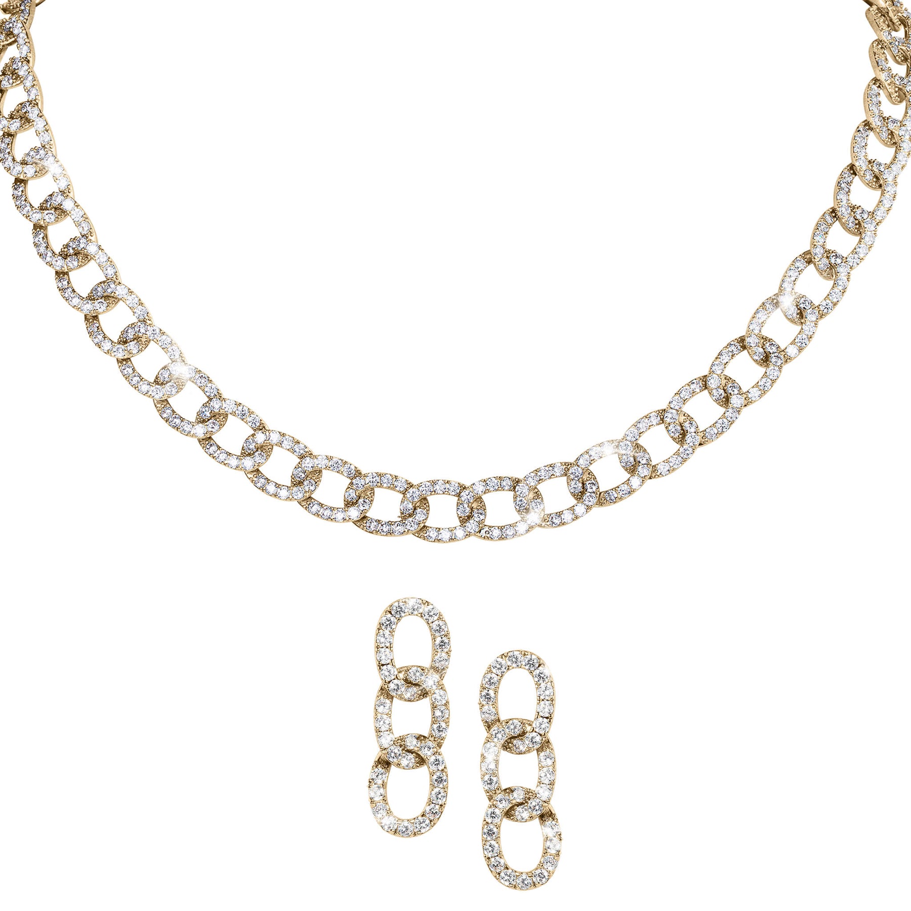 The perfect complement to add to your ensemble. The necklace boasts a beautiful crafted chain that sits gracefully around your neck, drawing the eye to the shimmering Diamondeau®, flawless simulated diamond that catches the light with every movement. Each stone is expertly cut and polished to perfection, ensuring maximum sparkle and brilliance that will captivate onlookers. Finished in yellow gold the classic Italian curb links lend a touch of old world charm to this set. Pair with the matching earrings that dangle delicately from your ears. This is sure to become a cherished addition to your jewelry collection.