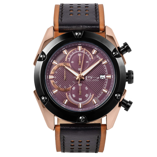 Introducing a bold design that features a unique dual-layered strap—a rich brown leather exterior, pierced to reveal a striking camel underlay. The contrast between the colors provides a distinct trim and eye-catching detail through the holes, creating a perfect blend of style and sophistication. Encased in refined rose gold, the watch has a robust black bezel with sleek screw accents. The rich wine dial captivates with its intricate detailing, chronograph functionality, and a neatly positioned date window, balancing form and function.