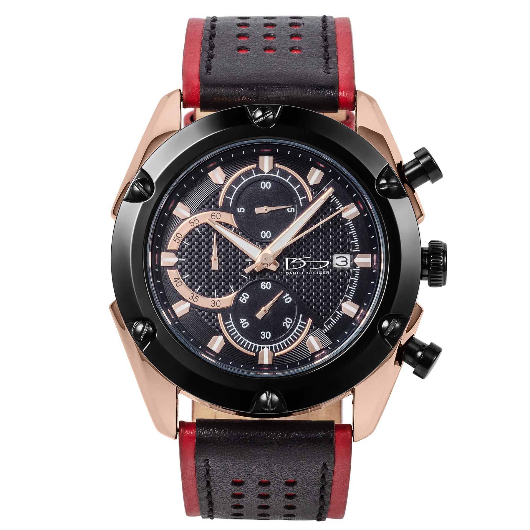 Introducing a bold design that features a unique dual-layered strap—a rich black leather exterior, pierced to reveal a striking deep red underlay. The contrast between the colors provides a distinct trim and eye-catching detail through the holes, creating a perfect blend of style and sophistication. Encased in refined rose gold, the watch has a robust black bezel with sleek screw accents. The deep black dial captivates with its intricate detailing, chronograph functionality, and a neatly positioned date window, balancing form and function.