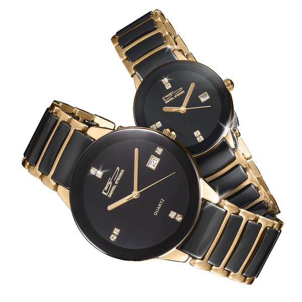 A bold fusion of black ceramic and stainless steel finished in yellow gold or steel finish to make a powerful statement. This striking combination of black and gold, exudes a refined sophistication that is both modern and timeless. The black dial serves as the perfect backdrop for the 7 Diamondeau®, flawless simulated diamond, precisely set at 12, 3, 6 & 9 o’clock positions. Functional and stylish the watch features a handy date window, keeping you on schedule and informed at a glance. Designed for the discerning man or stylish woman that values both form and function.