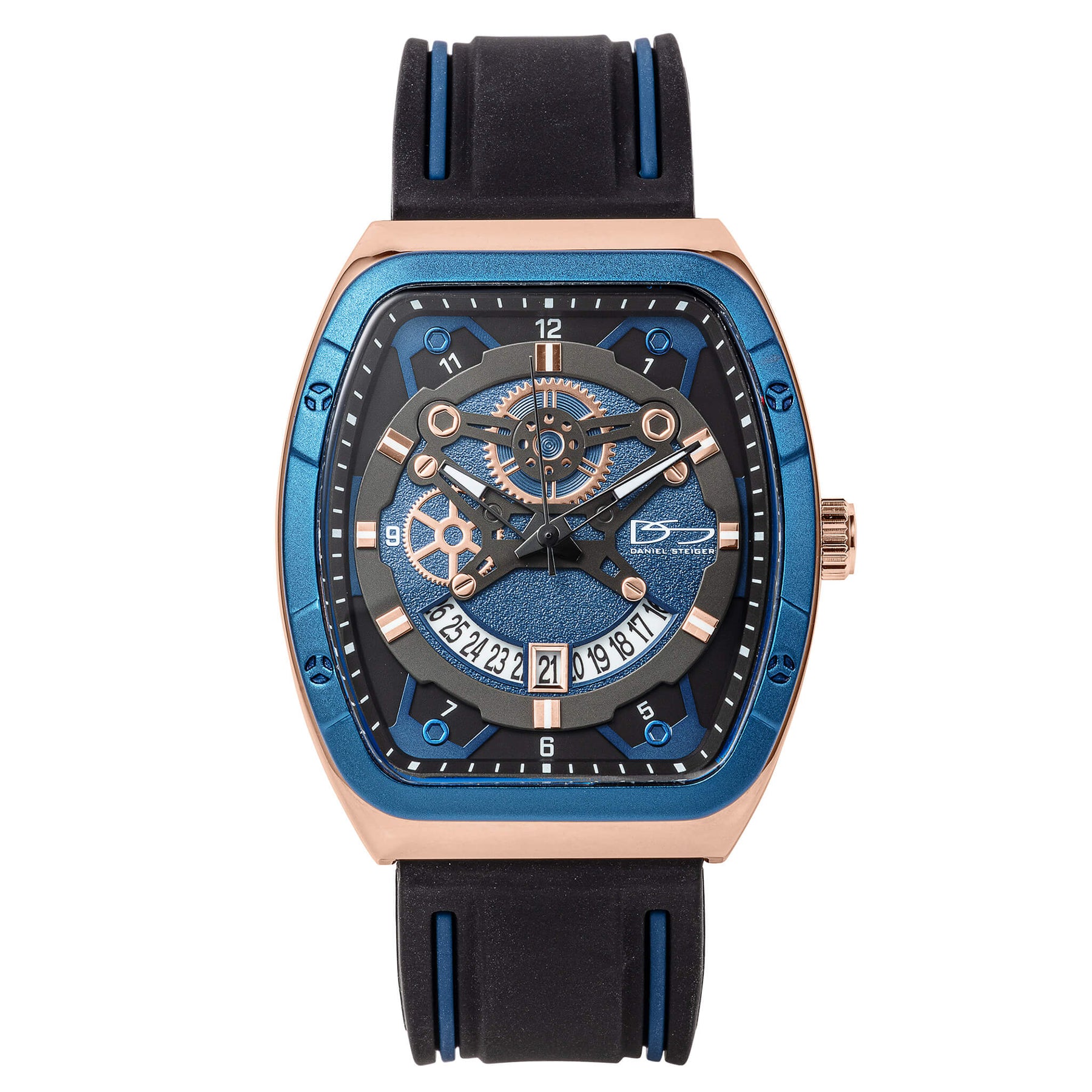 A standout watch that combines sporty aesthetics with intricate design. A robust silicone black strap, offers comfort and durability for everyday wear. The unique tonneau- shaped case is elegantly finished in rose gold, contrasted by a striking blue bezel that exudes sophistication. The standout feature of this watch is the dial, showcasing cog detailing. The design element not only highlights the craftsmanship behind the timepiece but also adds a dynamic and interesting visual appeal. A convenient date window keeps you on track and informed, making this watch as practical as it is stylish.