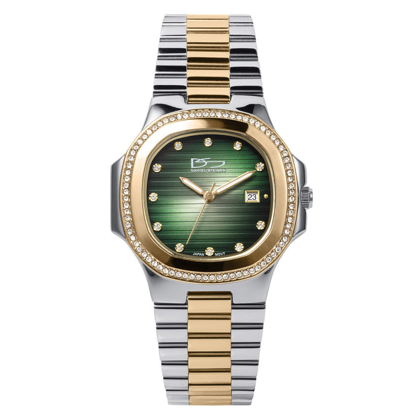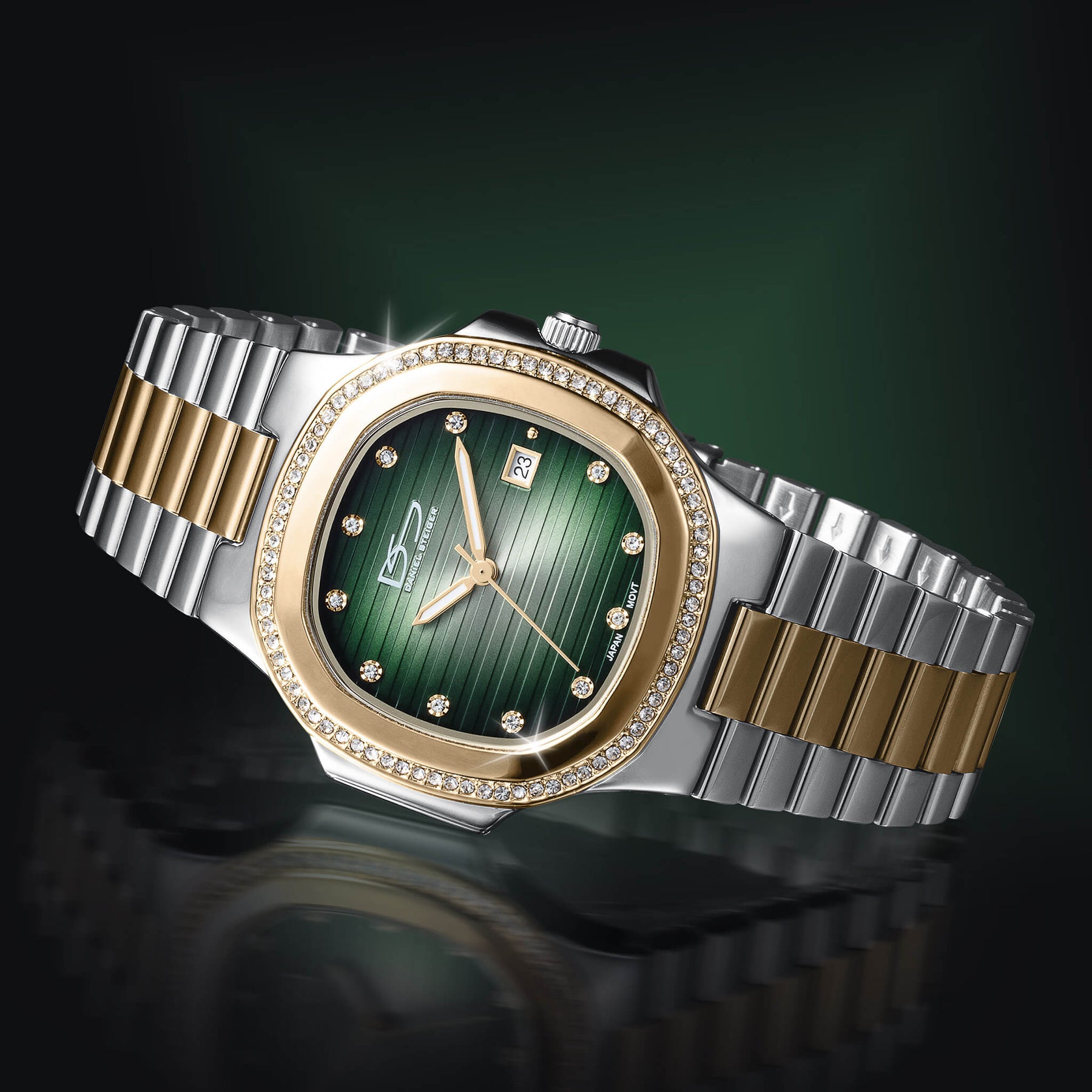 These watches exude timeless elegance with a classic bracelet strap in a luxurious two-tone finish. The distinctive fancy shaped case is adorned with a bezel set with stunning Diamondeau®, flawless simulated diamond, creating a bold statement of refined style. The grooved linear dial adds a sophisticated texture, further elevated by the sparkling stones that serve as indices. A convenient date window at 3 o’clock enhances functionality, making this standout timepiece a perfect blend of form and function. Ideal for those who appreciate classic design with a touch of modern glamor.