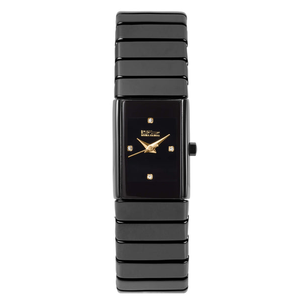 Improve your style with this black ceramic watch, where modern design meets unparalleled craftsmanship. The sleek ceramic case and bracelet in a striking polished black finish exude sophistication. The bold black rectangular dial is complemented by a refined gold finished 3-hand quartz movement, featuring a convenient date window for practical elegance. 4 Diamondeau®, flawless simulated diamond set at 12, 3, 6, and 9 o'clock add a touch of luxury and precision, ensuring every detail shines. Crafted for the woman who values both form and function, this timepiece is the ultimate statement of style and distinction.