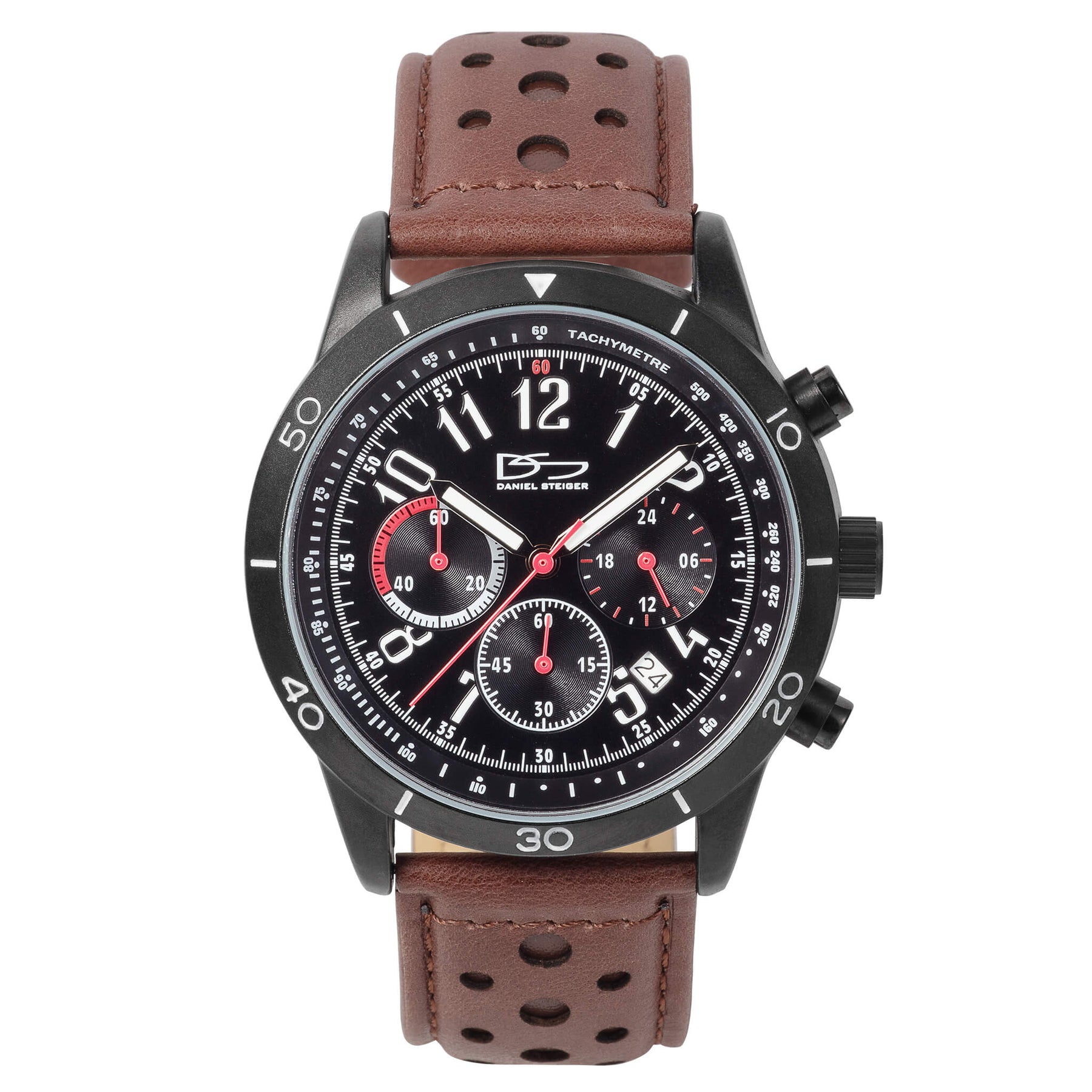 A fusion of classic and contemporary style, sure to elevate your wrist wear collection to new heights. A rich, dark brown leather strap with supple texture provides both comfort and durability. What sets this watch apart are the circular holes integrated into the leather strap, adding a subtle yet distinctive touch. Encased within a sleek black case, this watch houses a precision chronograph movement. A date window positioned seamlessly offers convenience at a glance. Contrasting white hands and numbers against a black backdrop allow you to effortlessly read the time. More than just a timekeeping instrument, this is a testament to your discerning taste.