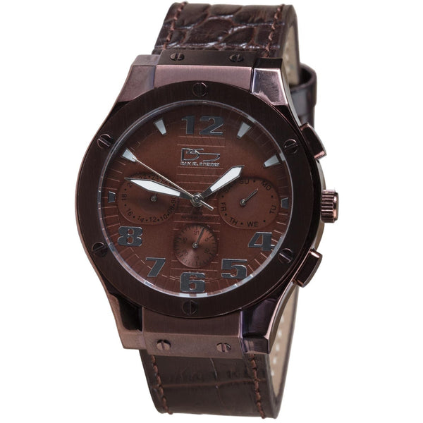 He’ll be bound to fall in love with this watch at first sight; the shear decadence of the mocha brown, yellow or rose gold plating on the premium stainless steel cases will win him over. A multi-function movement with date, day and 24H windows sit proudly on the dial. All brought together with a textured luxury brown leather band. A perfect timepiece smart enough for an evening function, the office or to the gym.