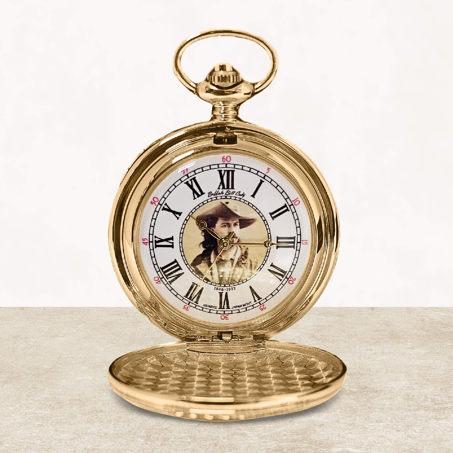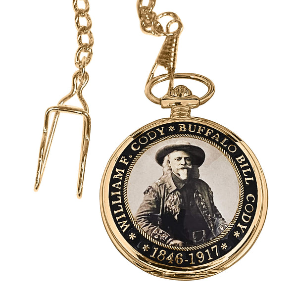 Step into the untamed spirit of the American frontier with this Buffalo Bill pocket watch—a true tribute to one of the West’s most celebrated showmen and scouts. Famed for his Wild West shows and legendary exploits as a scout and buffalo hunter, Buffalo Bill helped bring the myth and drama of the frontier to audiences around the world. At its heart lies a finely detailed portrait of Buffalo Bill, encircled by his name and birth and death years, etched with precision to honor his iconic legacy. Finished in gleaming yellow gold and paired with a traditional pocket chain, this timepiece blends heritage style with timeless craftsmanship. Whether you're a history enthusiast, a collector, or a man of classic taste, this watch captures more than time—it captures the enduring spirit of the West.