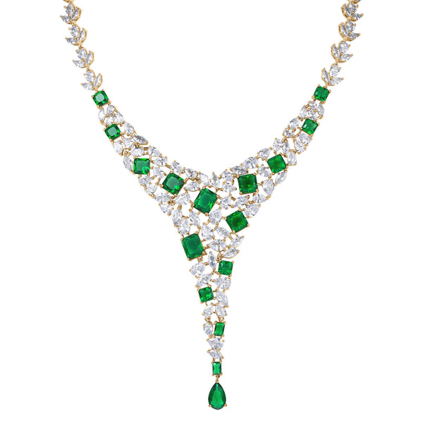 The Willow statement necklace offers an estate style design, coupled with the elegance of Old Hollywood. This gorgeous collection is bursting with vibrant green color. Each marquise, pear, cushion and emerald stone is of our signature Diamondeau® - flawless simulated diamond. This statement piece is absolutely breathtaking, all finished in luxurious yellow gold, making it a perfect complement to any outfit.